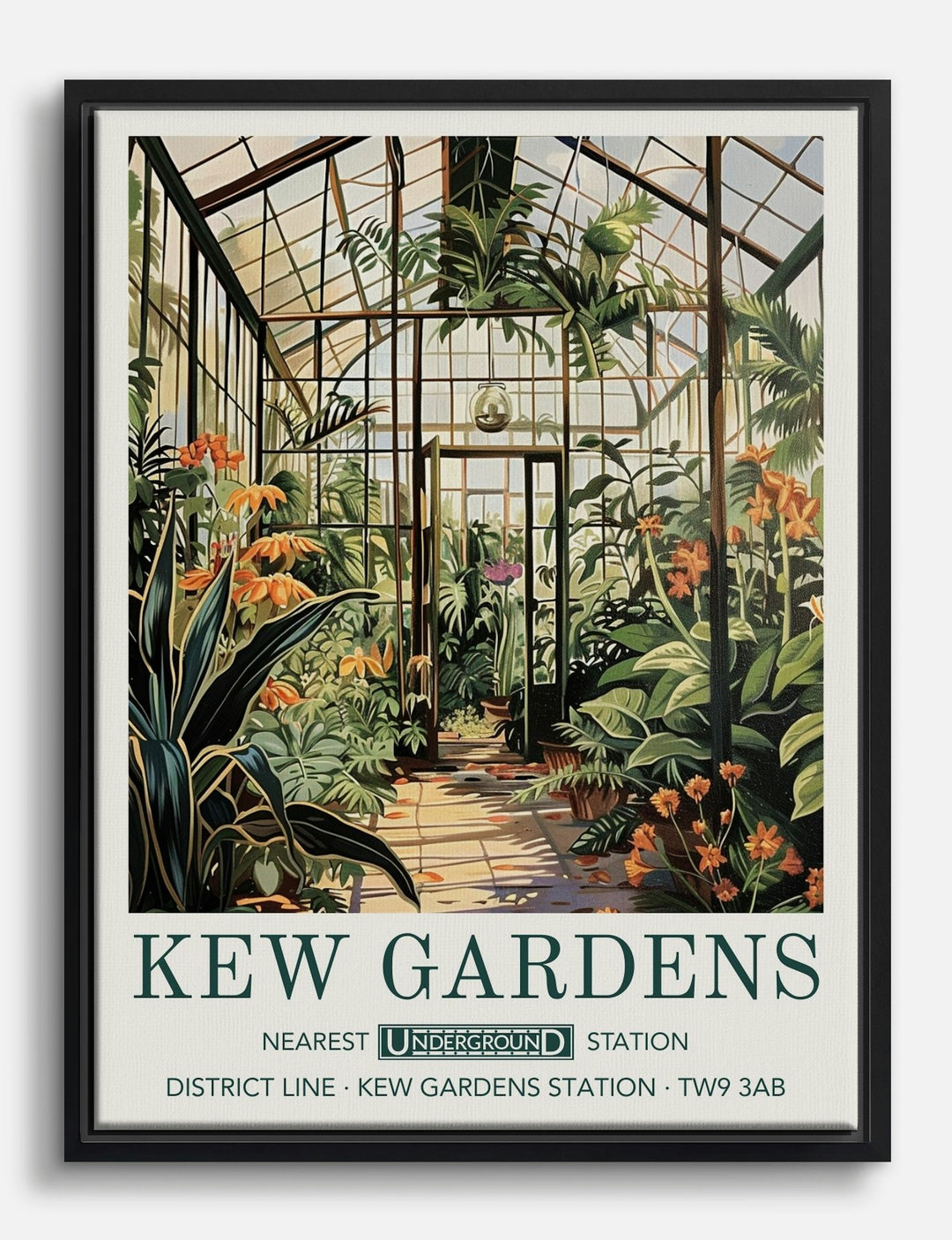 Step into a lush paradise with this vibrant depiction of Kew Gardens. Let the rich greens and warm oranges transport you to a serene greenhouse haven. Perfect for your living room or office, this piece effortlessly complements both modern and vintage decor styles. Feel the joy of nature’s embrace and elevate your space with this unique artwork that promises to inspire and rejuvenate every day.