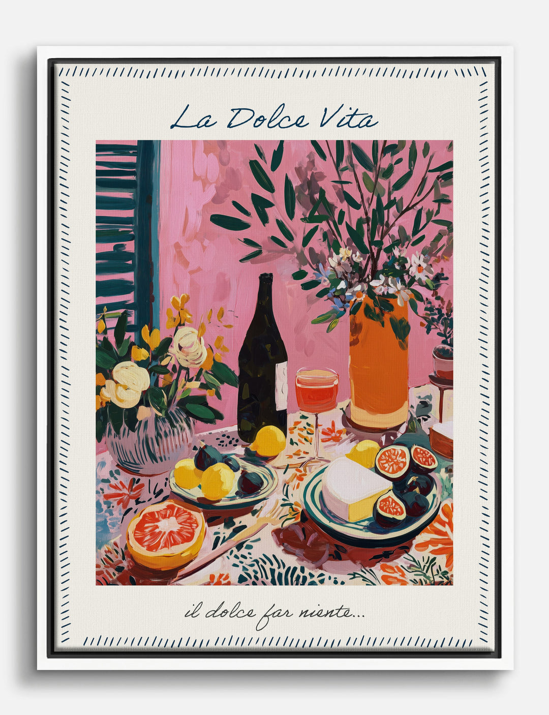 Step into a sun-soaked Italian afternoon every time you walk by this vibrant piece. Lush fruits, a bottle of wine, and blooming florals spill across a table, inviting you to savor lifes simple pleasures. The bold pinks and rich greens pop against any wall, instantly energizing your space and creating a feeling of warmth and abundance.