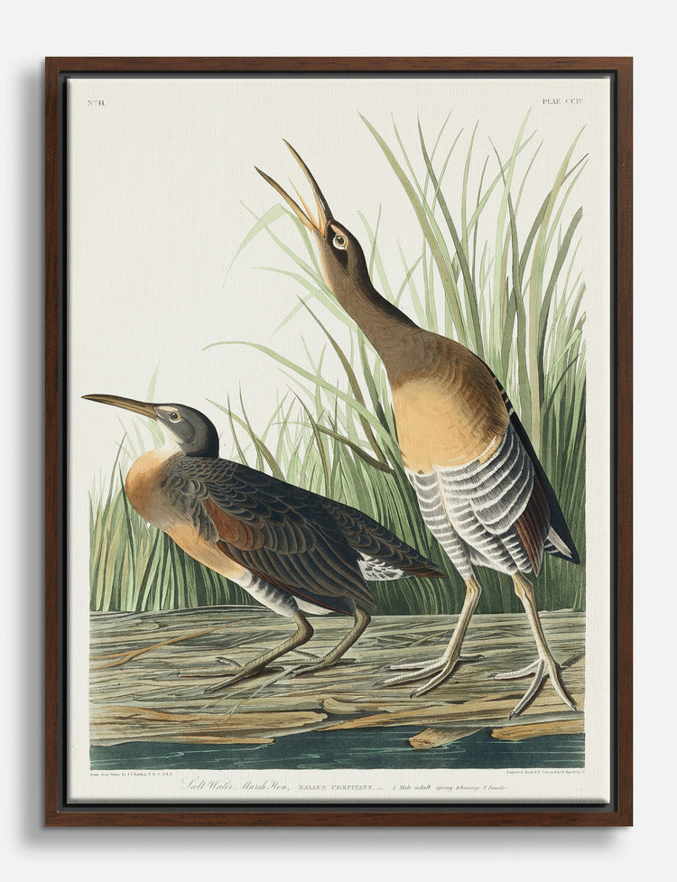 El coro de la naturaleza cobra vida en este lienzo clásico de Audubon, con dos llamativas gallinas de las marismas posadas entre altas hierbas. Los tonos tierra en marrones y grises suaves aportan una calma arraigada, mientras las poses vivas añaden un destello de movimiento y energía. Perfecto para crear un refugio sereno en el salón o añadir un toque de encanto vintage a un estudio acogedor. Su paleta natural se integra sin esfuerzo con neutros, maderas rústicas e incluso con una decoración minimalista moderna, lo que lo convierte en una pieza versátil para tu colección. Deja que esta obra te recuerde la belleza de lo salvaje e inspire orgullo cada vez que la mires. No necesitas una gran reforma para transformar tu espacio: basta con una pieza única y con historia como esta.