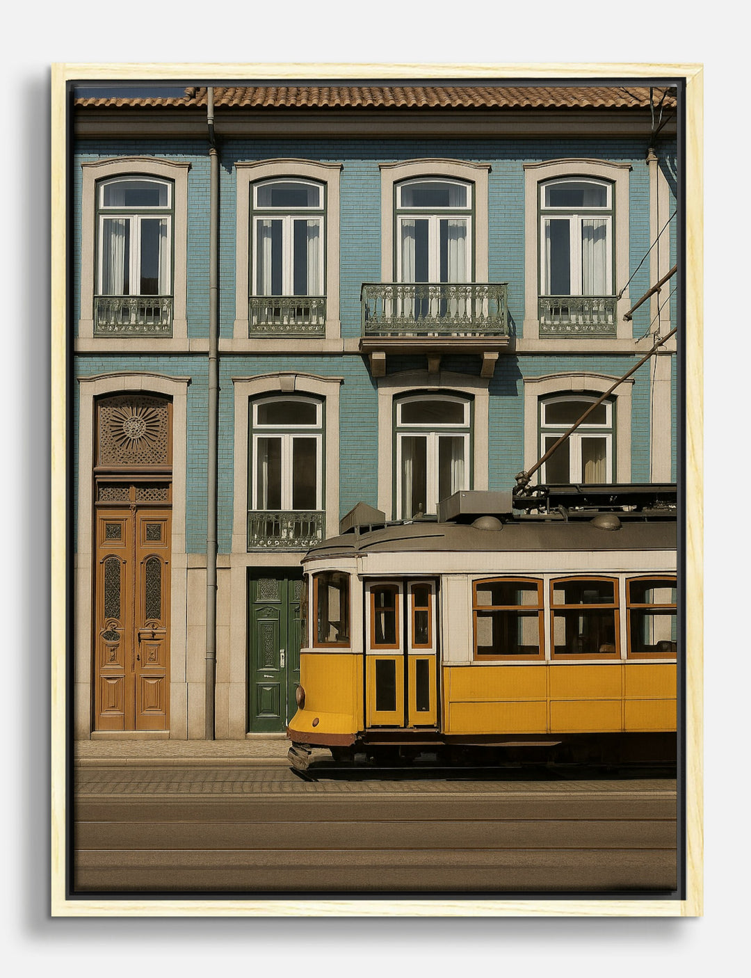 Bold pops of yellow glide past classic blue facades, bringing a touch of European adventure right into your home. This piece captures the spirit of Lisbon’s sun-soaked streets—effortless, lively, and full of character.