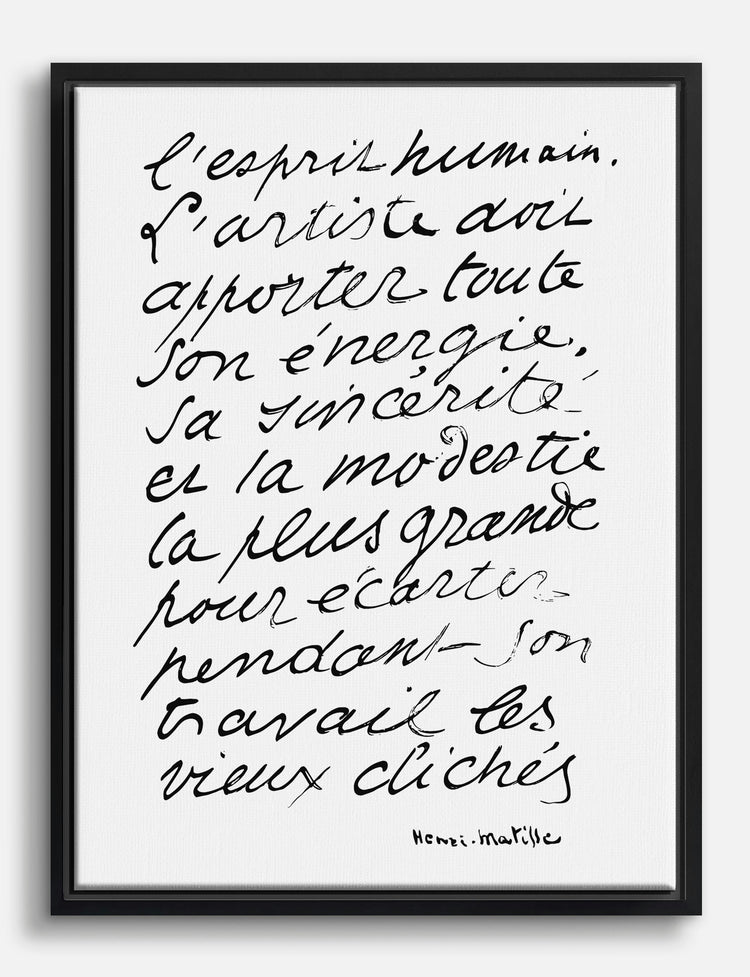 Feel the creative spirit of Henri Matisse infuse your space with this elegant typography piece. Each line, written with sincerity and grace, invites you to embrace originality and authenticity in your everyday life. Perfect for your office or living room, this artwork complements any decor style with its classic black and white palette. Transform your home into a sanctuary of inspiration and self-expression with this timeless quote.