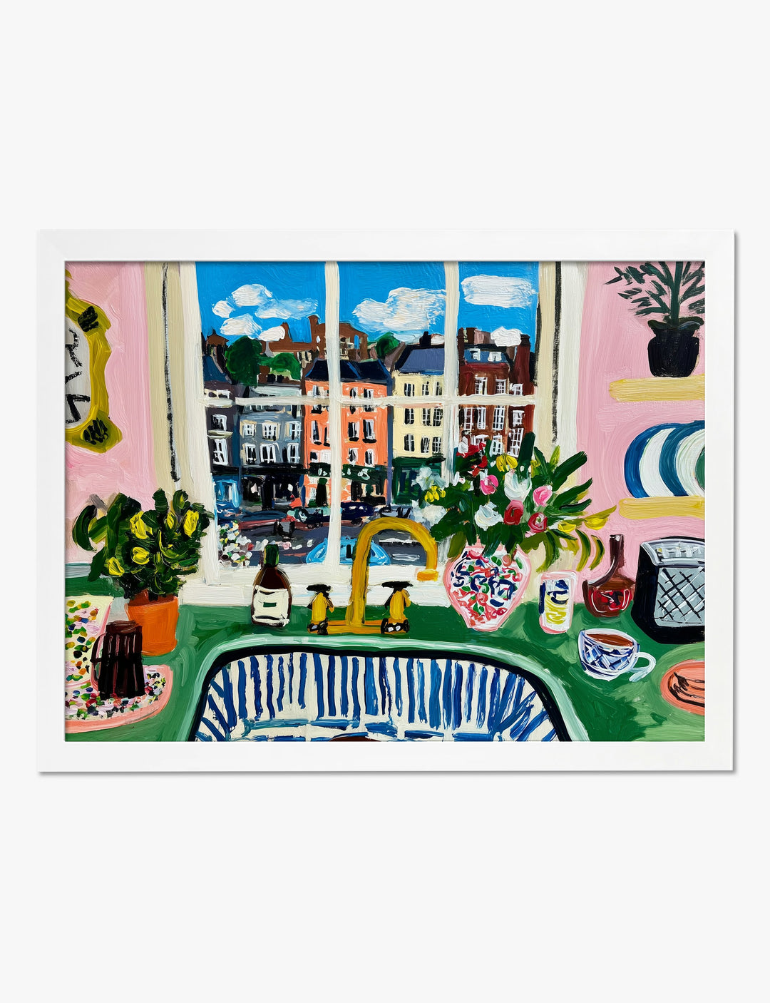 Step right up to a kitchen that pops with color and personality. This playful piece captures the simple joy of daily life — blue skies, bright facades, and a cozy countertop full of everyday treasures. You’ll feel the energy of a bustling city outside, while the inside glows with florals, plants, and that iconic striped sink. Hang this in your kitchen or dining room and watch the space come alive with warmth and charm. The vibrant palette — from pinks and greens to bold blues — makes it easy to pair with modern, eclectic, or vintage-inspired decor. You deserve walls that bring you a smile and tell your story. Let this artwork be your daily invitation to savor the beauty in the ordinary, right at home.