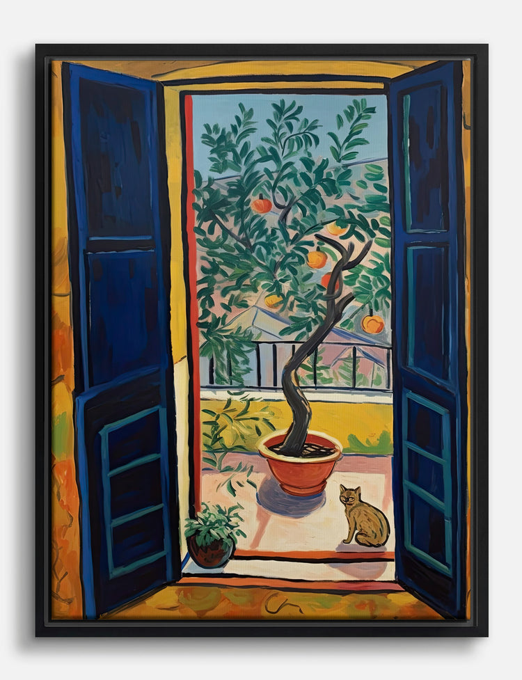 Sun-drenched mornings and the scent of citrus—this piece brings the heart of the Mediterranean right to your wall. A playful cat and potted orange tree invite you to pause, breathe, and enjoy the simple pleasures of home.