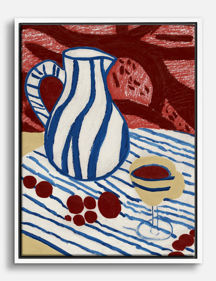 Bold blue stripes and playful red accents set the scene in this striking still life, inspired by the spirit of Matisse. There’s a vibrant energy here — a pitcher and glass that feel both classic and modern, ready to spark conversation and creativity in your space.
