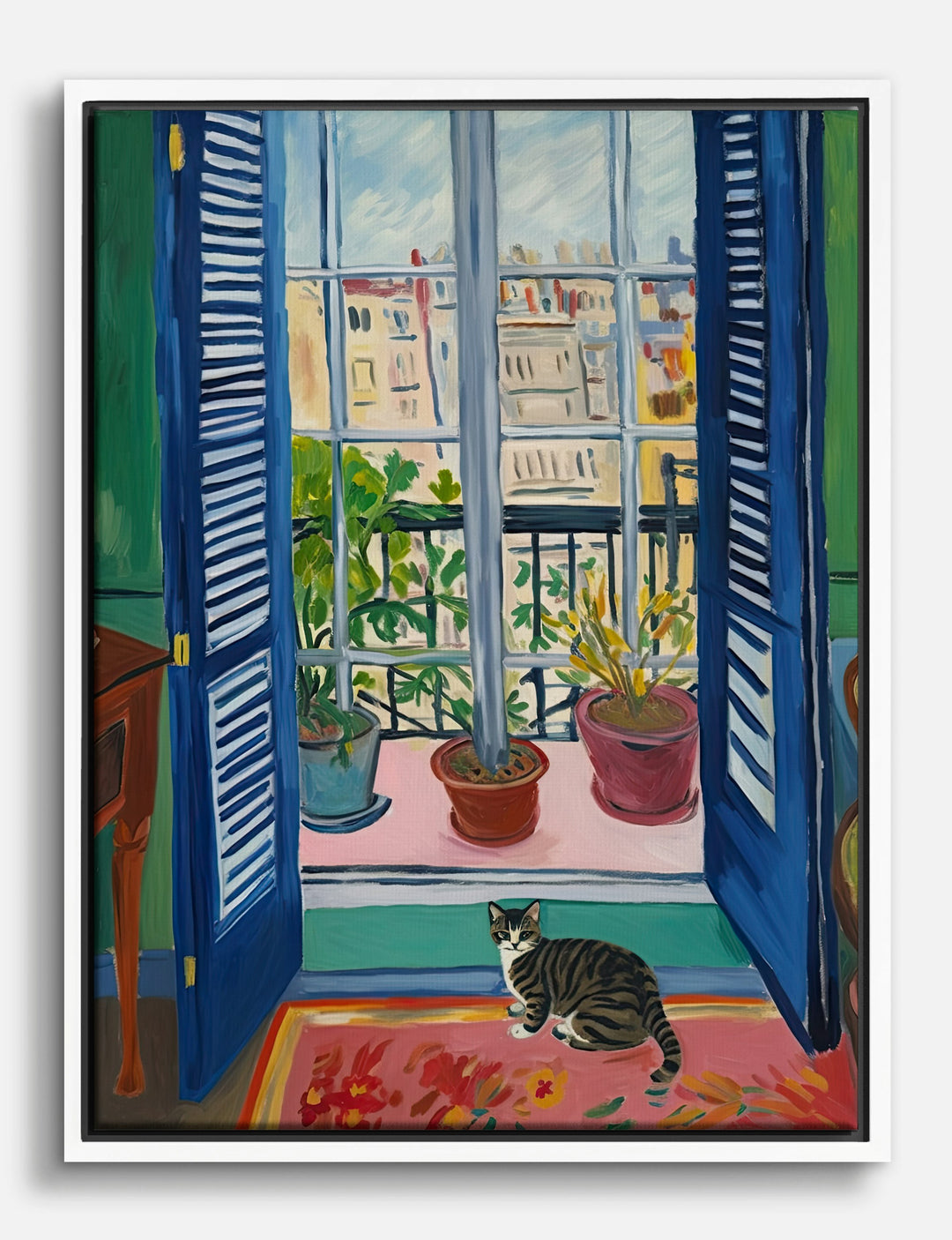 Step into a sunlit Parisian morning every time you walk by. Blue shutters swing wide to reveal a city view, lush potted plants, and a curious tabby cat waiting to greet you. This piece infuses any space with easygoing charm and an uplifting pop of color—perfect for your living room or bedroom.