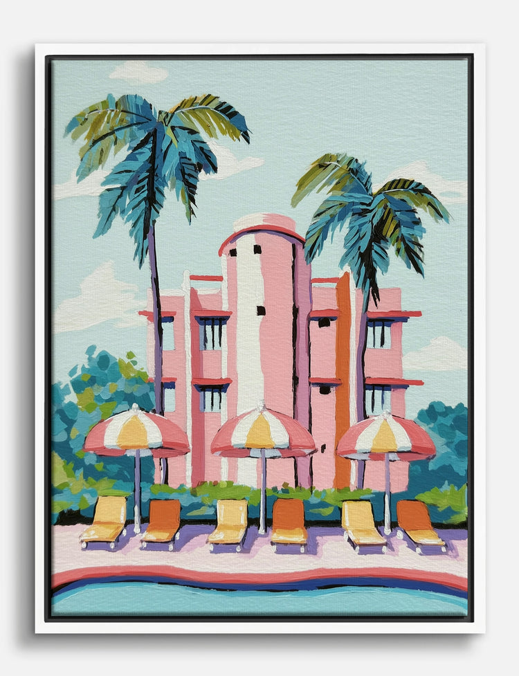 Step into a world where every day feels like a getaway. This playful, sun-soaked scene captures the effortless charm of Miami’s Art Deco allure, bringing a splash of retro-cool right to your walls.
