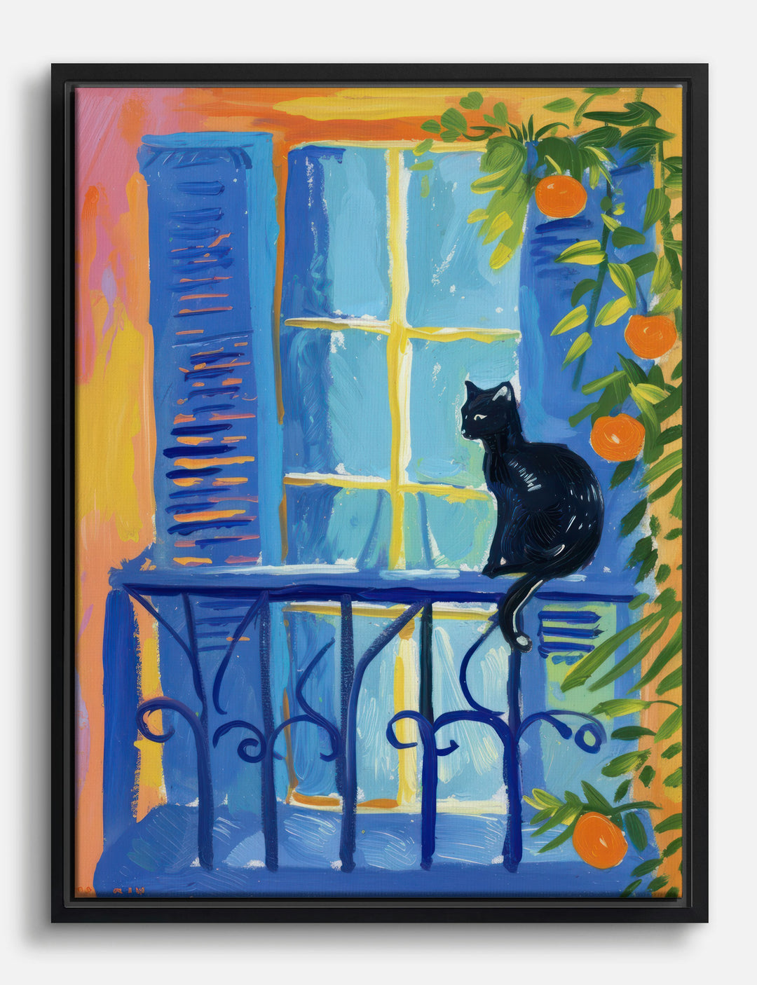 A black cat perched on a vibrant balcony brings a touch of whimsy and charm to your space. This piece captures the serene beauty of twilight, with deep blues and oranges that pop against the playful feline silhouette. Perfect for your living room or bedroom, it complements both modern and bohemian decor, adding a splash of color and character. Transform your home into a cozy, stylish retreat with this unique artwork.