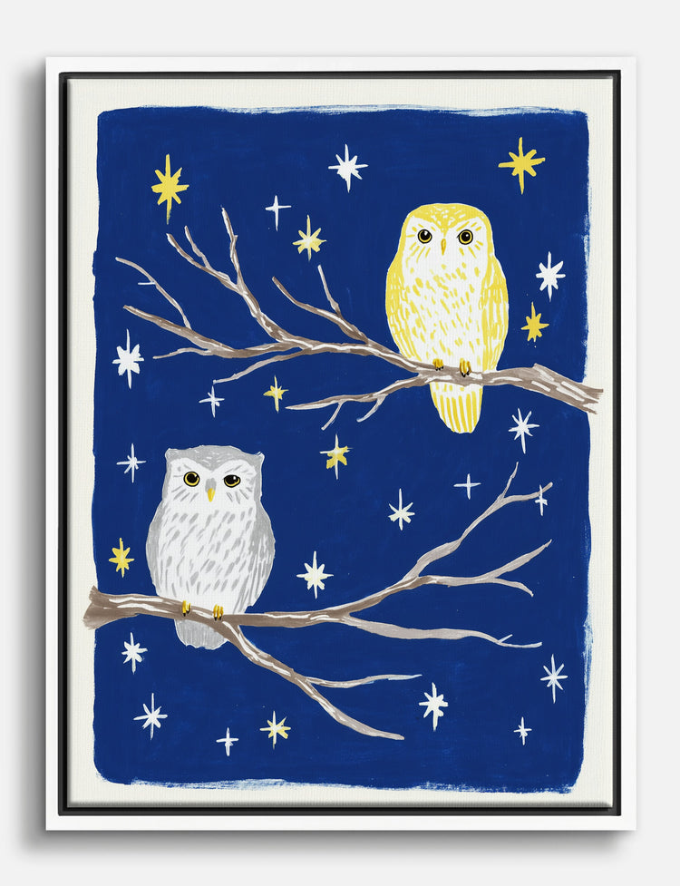 Under a deep navy sky, two wise owls perch quietly among silvered branches, keeping gentle watch as stars twinkle all around them. This piece brings a peaceful, storybook charm to any room, inviting you to slow down and savor the magic of nighttime.