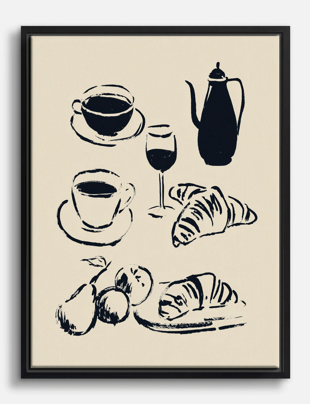A cozy morning ritual, captured in bold, simple strokes—this piece brings the warmth of a Parisian café right into your home. The playful arrangement of coffee cups, croissants, and fruit sets the scene for slow mornings and everyday joys. Youll love how its monochrome palette makes it both timeless and versatile, blending beautifully with any decor style—modern, rustic, or anything in between. Hang it in your kitchen or dining nook for a daily reminder that little pleasures matter most. No need for a major makeover—this art is your shortcut to effortless style and comfort. Let your walls tell a story of delicious mornings and relaxed gatherings, all with a touch of chic, European flair.