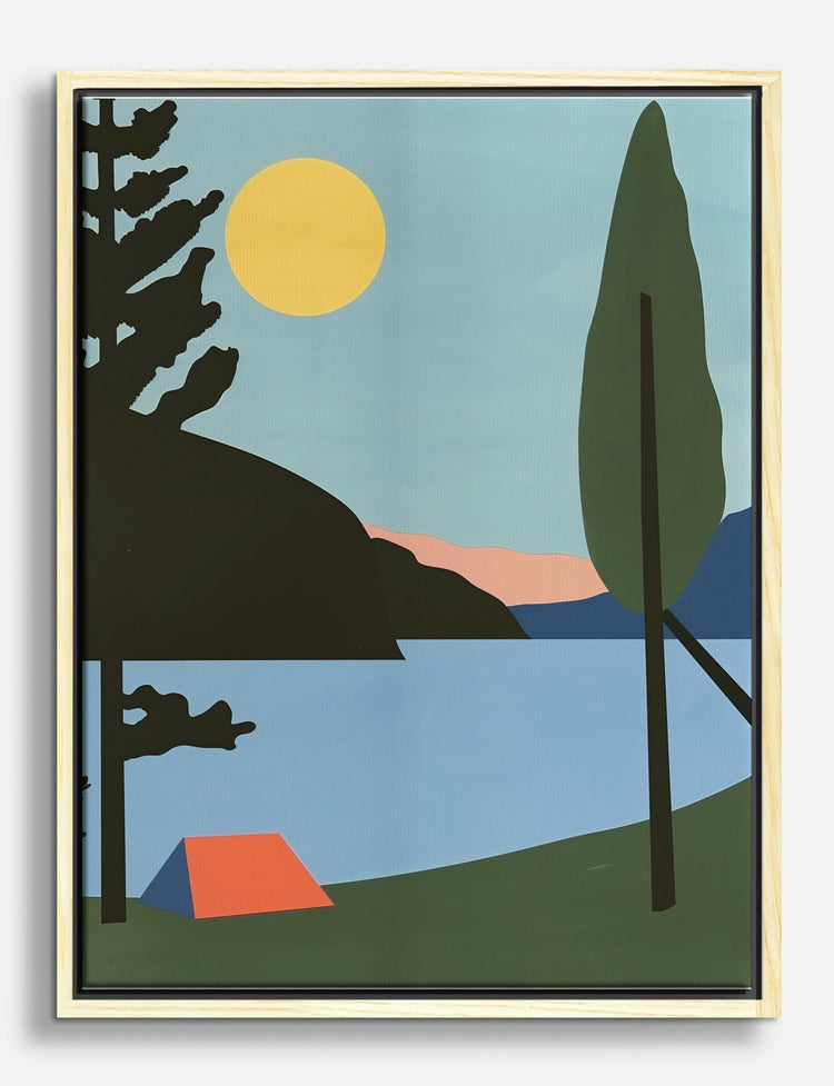 Step into tranquility with this enchanting piece that captures the serene beauty of a lakeside campsite under a glowing moon. Perfect for your living room or bedroom, the soothing palette of blues and greens effortlessly complements any decor style, while the hint of sunset pink adds a touch of warmth. Let this artwork bring a sense of peace and inspiration to your space, transforming it into a personal haven of calm and creativity.