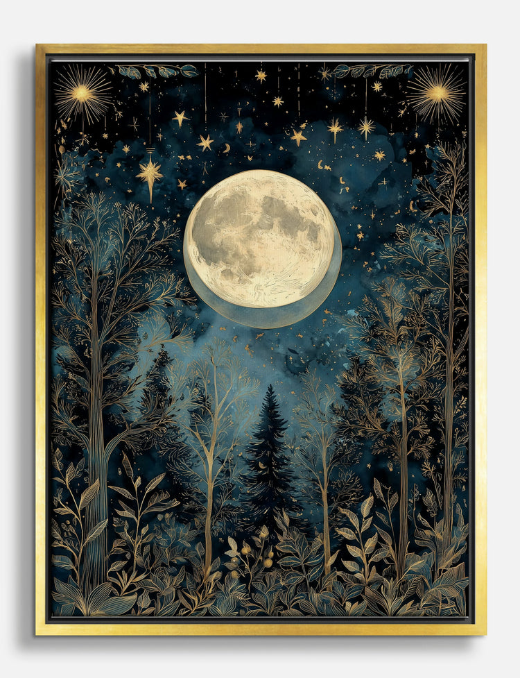 Step into a magical midnight forest, where the full moon glows bright and golden against a dreamy navy sky. This enchanting piece wraps your space in calm, inviting you to slow down and savor the beauty of nighttime wonder.