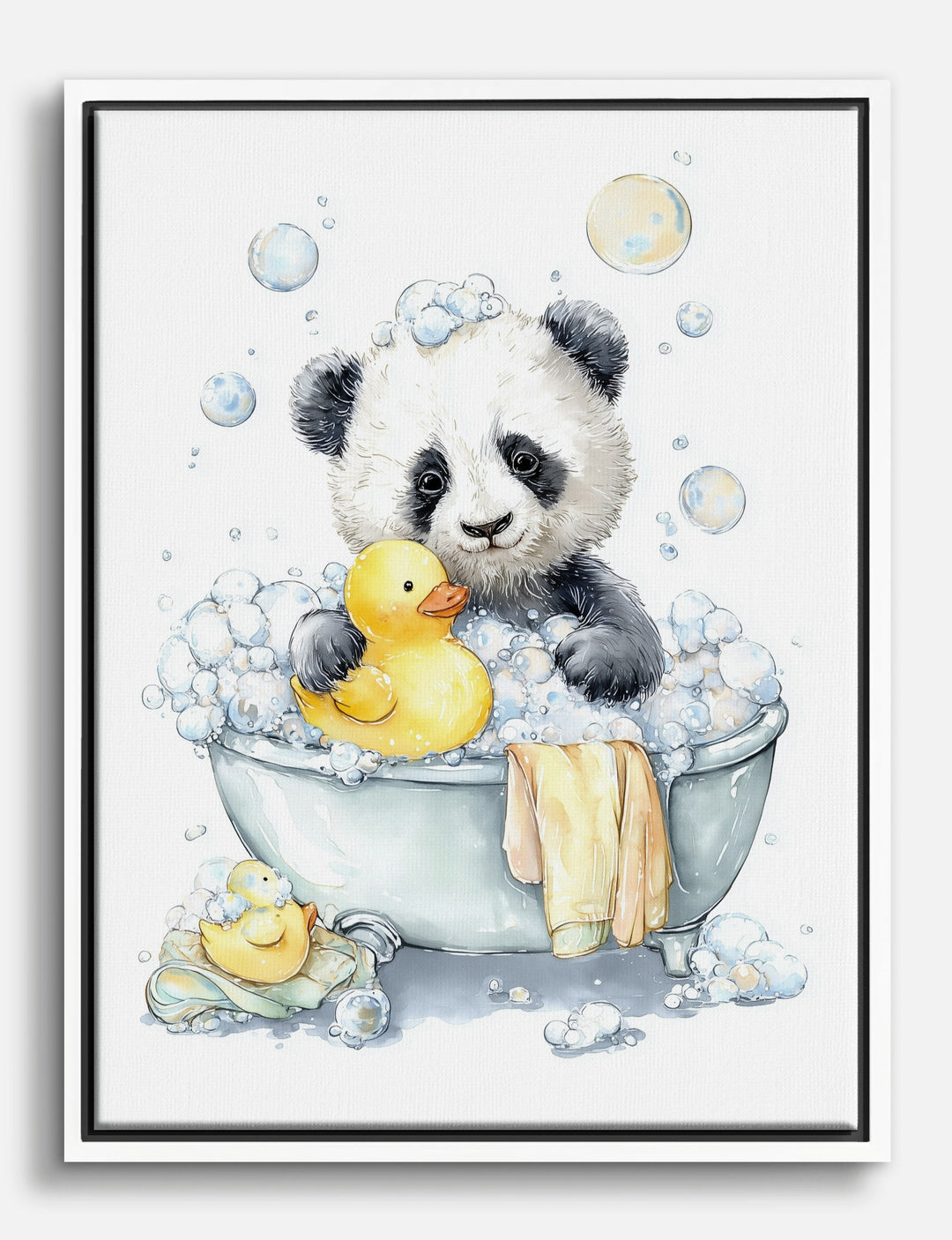 Sudsy bubbles, a playful panda, and a classic rubber duck—this piece brings instant cheer to any space. Imagine the smiles as this adorable scene turns your nursery or kids’ room into a haven of lighthearted fun. The soft washes of white and black, paired with pops of yellow, fit effortlessly alongside both modern and traditional décor.
