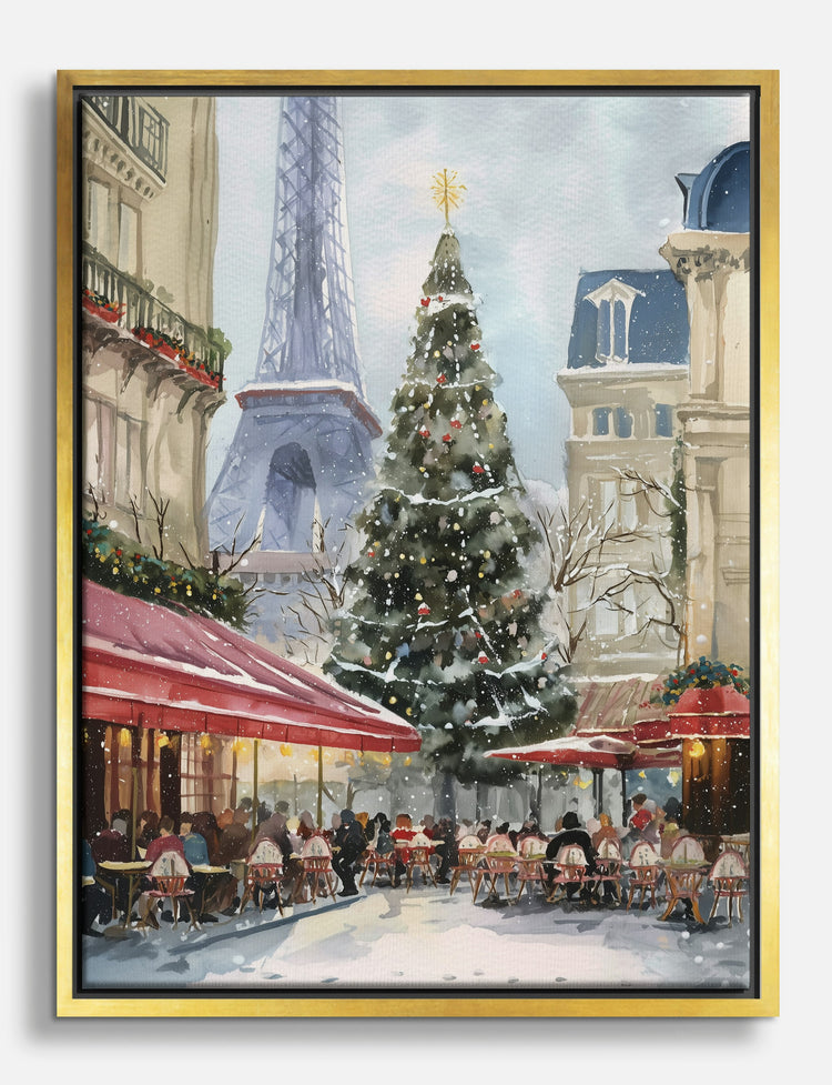 Twinkling lights, cozy cafés, and a dusting of snow—this piece captures the magic of a Paris Christmas in one unforgettable scene. The Eiffel Tower peeks through a wintry sky as a grand Christmas tree becomes the heart of the city, radiating warmth and festive spirit.