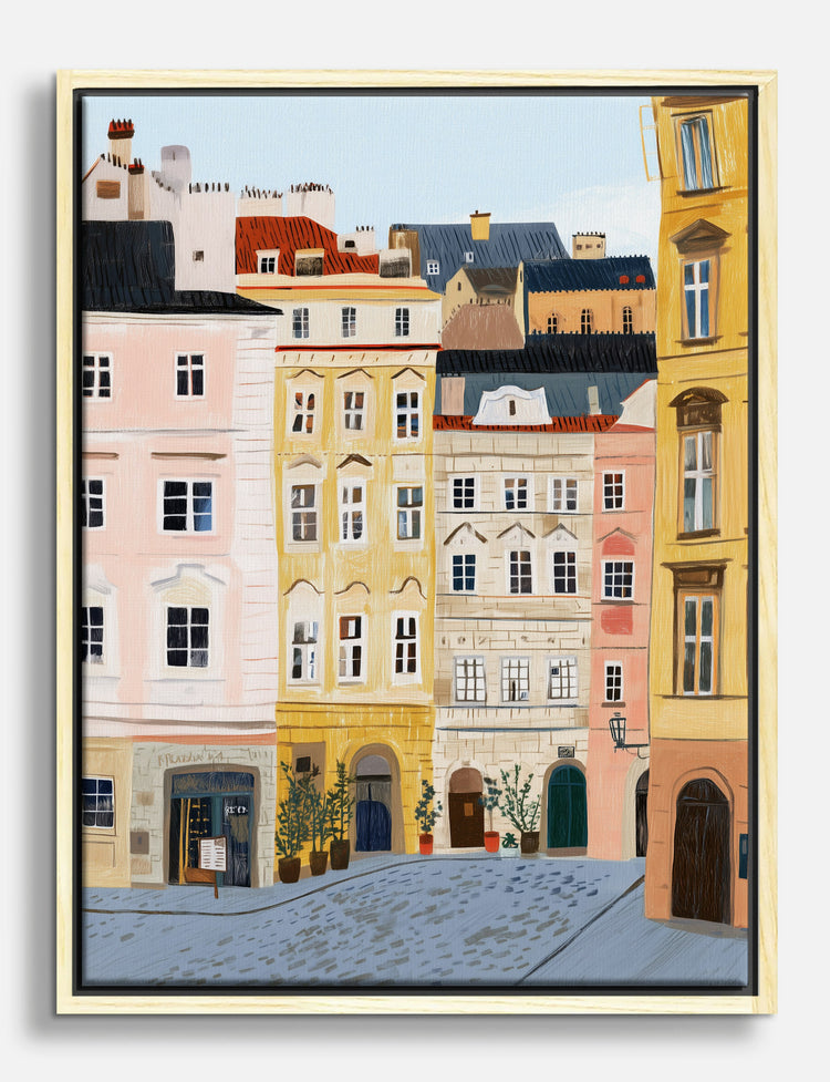 Sunlight spills across charming cobblestone and candy-colored facades in this lively city scene. With every glance, you’ll feel whisked away to a European morning—coffee in hand, ready to wander.