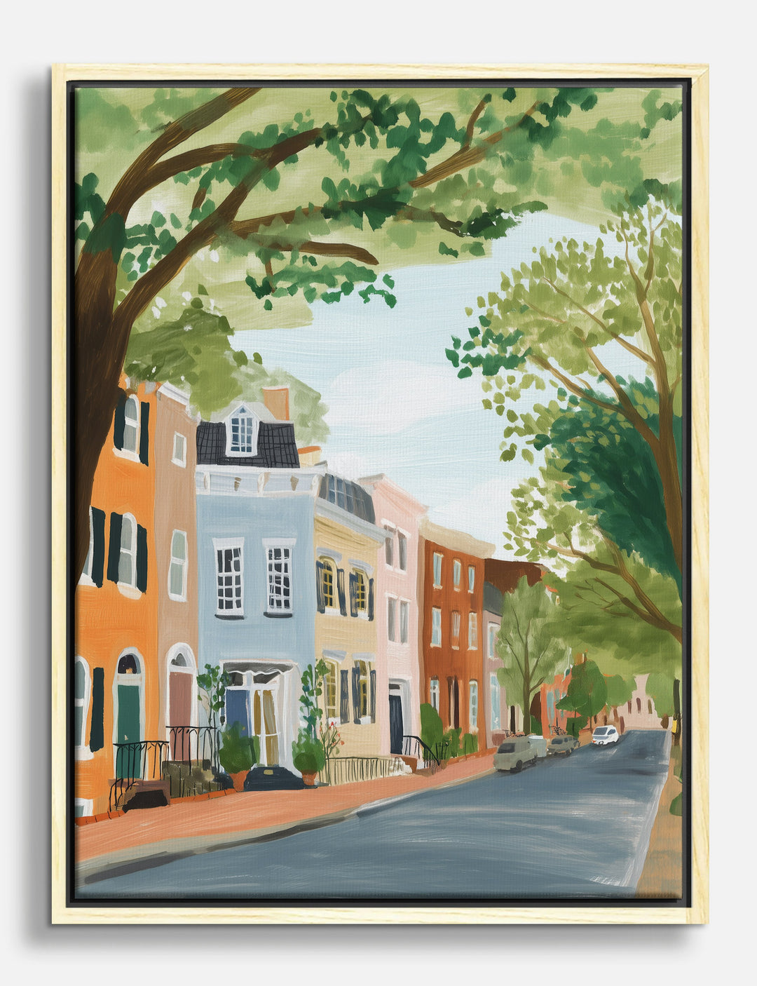 Step into a world where city charm meets soft serenity. This inviting street scene, with its pastel-hued rowhouses and leafy trees, brings a breath of fresh air to your walls. Imagine the gentle light and cozy vibes it adds to your favorite corner.