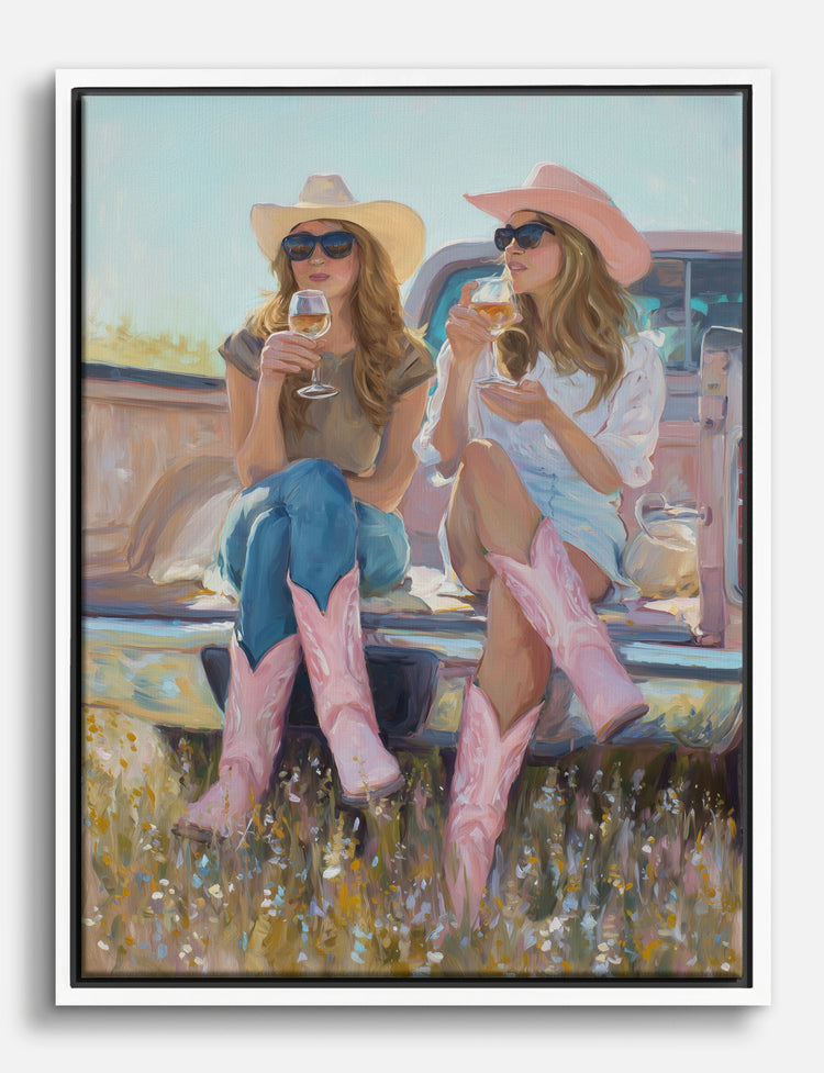 Two friends, endless blue skies, and a tailgate picnic—this piece radiates pure, easygoing joy. Pops of pink in their boots and hats add a playful, stylish twist, making it the perfect statement for anyone who loves a little country flair with their comfort.