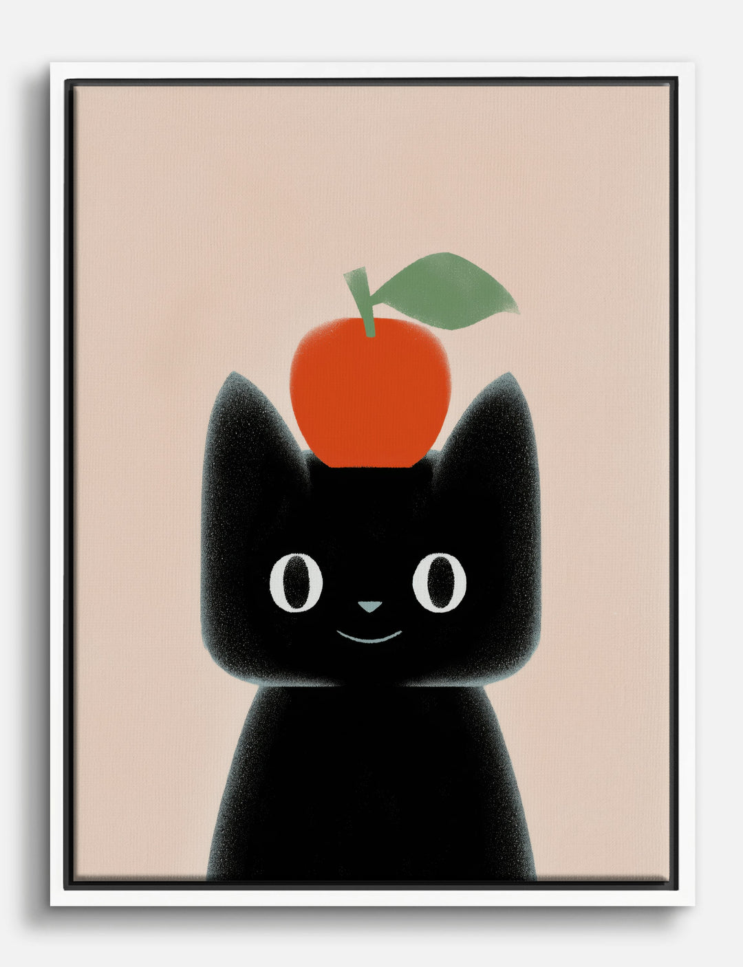 A curious black cat with wide, friendly eyes sits proudly with a bright red apple perched on its head. This piece instantly sparks a smile—its the kind of art that brings a sense of play and personality to any room.