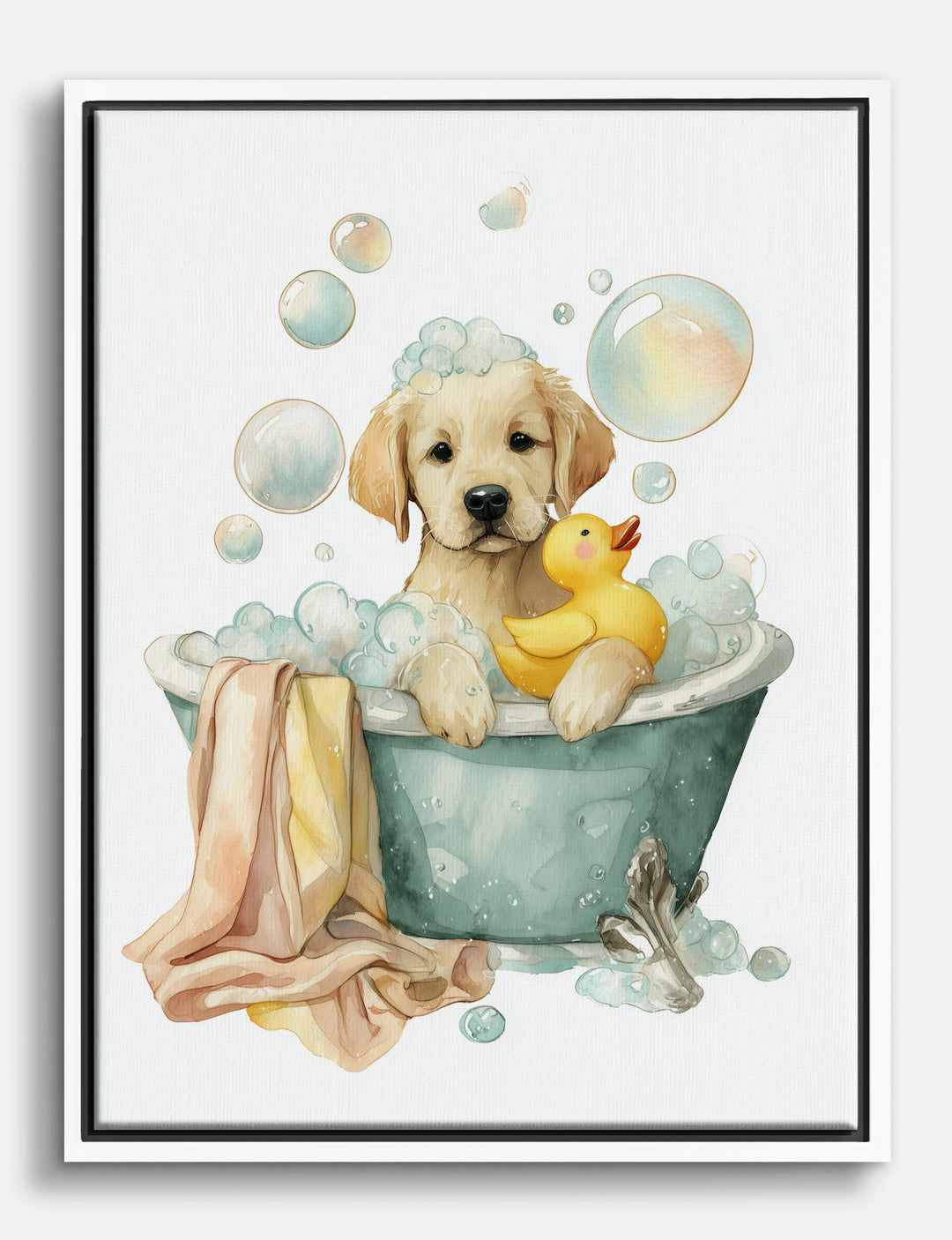 Who says bath time can’t be the cutest moment of your day? This playful print features a golden puppy peeking out of a sea of bubbles, rubber ducky in tow, ready to melt your heart. Soft pastels and gentle blues make it a perfect fit for any nursery or kids’ room, adding a splash of cheer and innocence.