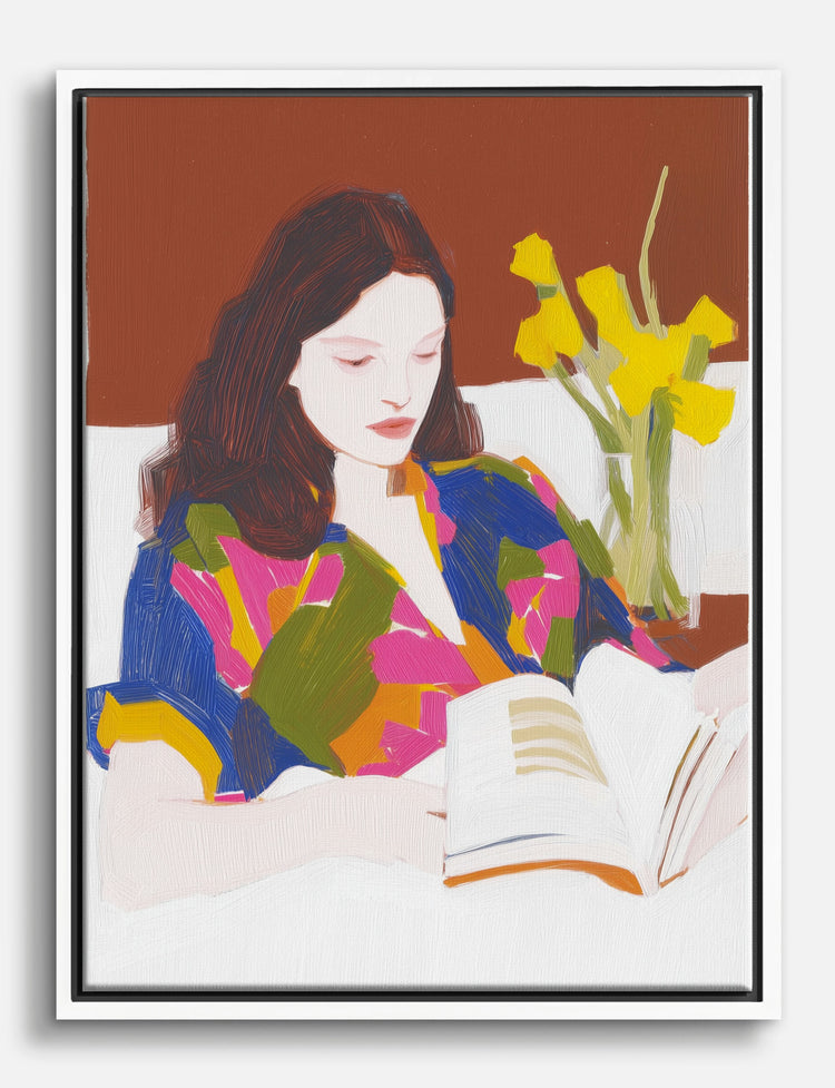 A pop of color, a moment of calm—this piece captures the quiet joy of getting lost in a good book. Bright florals and bold patterns bring a lively, artistic energy, while the serene figure invites you to pause and unwind.