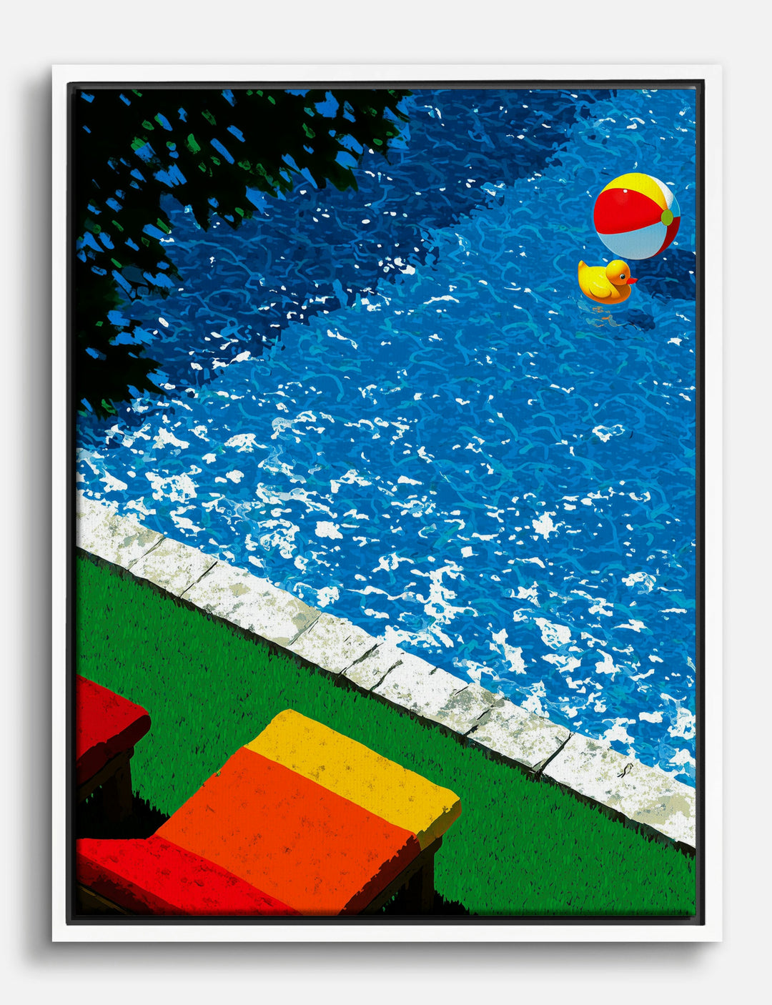 Sun-drenched afternoons and playful nostalgia come alive in this vibrant poolside scene. The sparkling blue water and colorful striped loungers instantly energize any space, making every day feel like summer vacation.