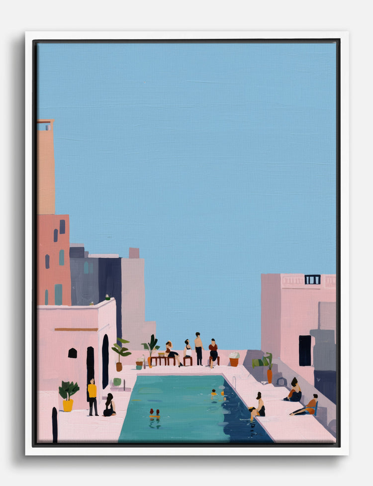 Sun-soaked rooftops and pastel city vibes come together in this playful scene, where every day feels like a getaway. With its cool blue pool and lively characters, this piece brings a breezy, uplifting energy that instantly brightens your space.