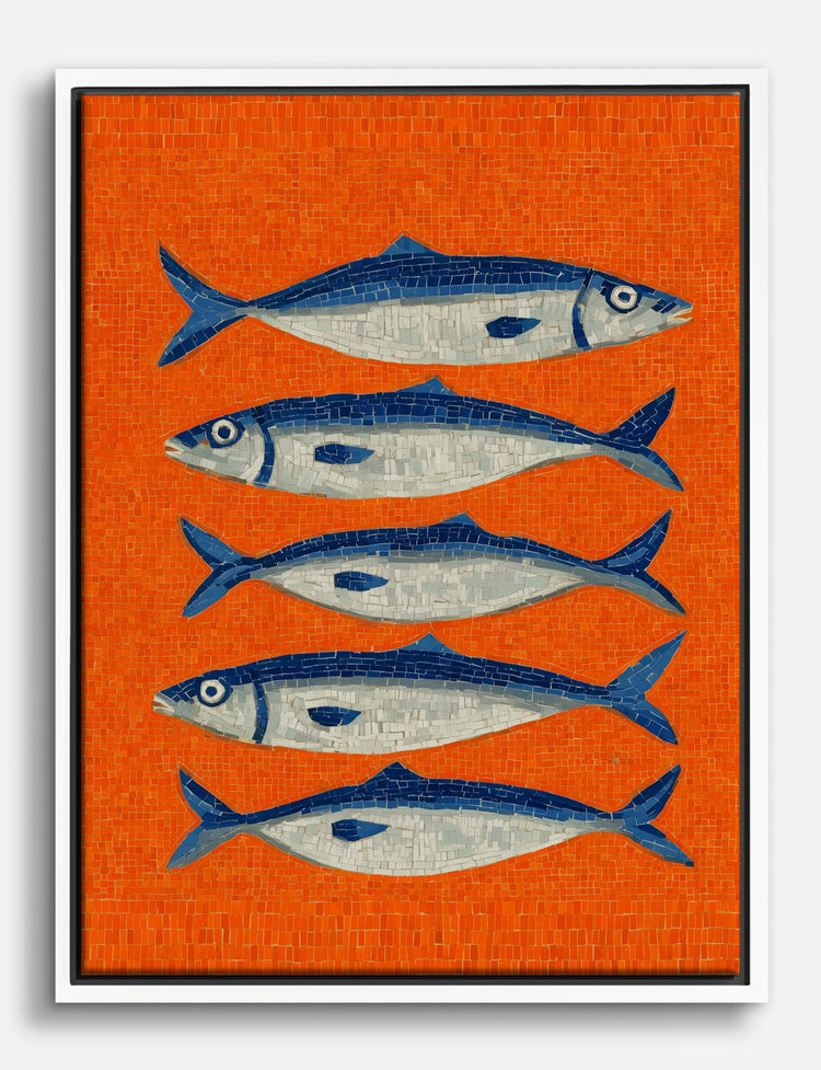 Bold, playful, and a little bit cheeky—this mosaic-inspired school of sardines brings instant personality to any space. The vibrant orange backdrop pops with energy, making even the simplest room feel fresh and alive.