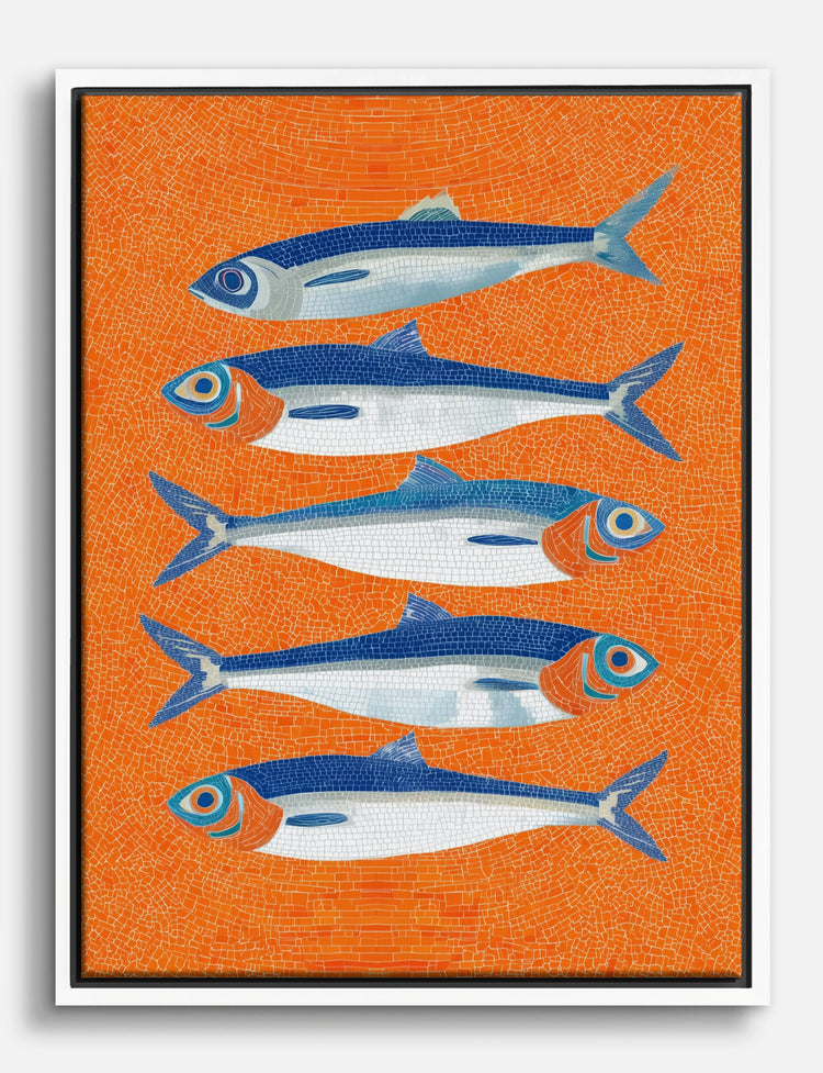 Bold, playful, and full of energy—this vibrant sardine mosaic instantly livens up any wall. The bright orange backdrop and sleek blue fish create a burst of color that’s impossible to ignore, making your space feel fresh and a little bit unexpected.