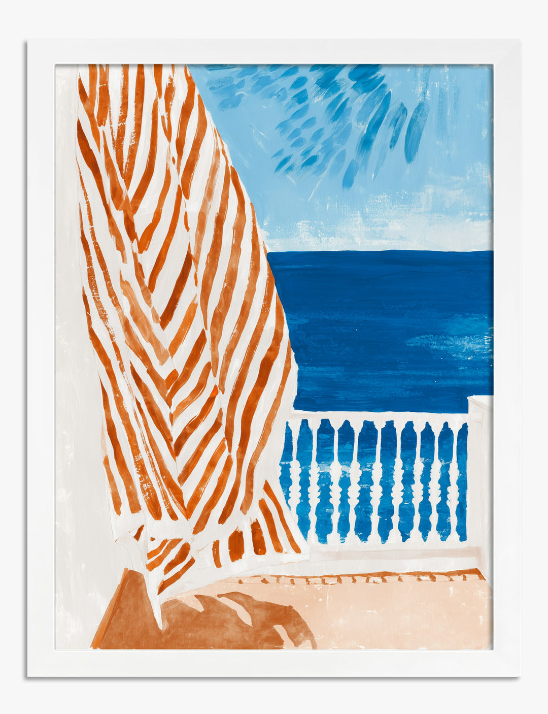 Bold stripes meet endless blue in this breezy coastal scene. You’ll feel the sun on your skin and the gentle salt air every time you pass by—no passport required. This piece instantly brings a sense of relaxation and effortless style to your favorite corner. Perfect for your living room or bedroom, it sets a mood that’s both uplifting and serene. The crisp blues and warm terracotta tones pop against neutral walls and blend beautifully with modern or Mediterranean-inspired decor. Let this artwork transport you—every day—to a sunlit balcony by the sea. Your home, your getaway, your style. All you need is a wall and a little imagination.