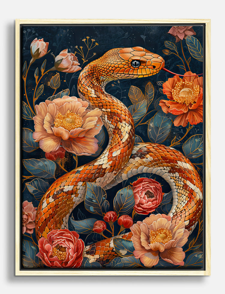 A striking serpent weaves its way through lush, blooming florals—bringing a touch of wild beauty and quiet strength to your space. This piece radiates confidence and transformation, making it perfect for anyone who loves a bold, nature-inspired vibe. Warm oranges and delicate pinks pop against deep, moody blues, making it a gorgeous fit for your living room or bedroom. Let this artwork become your daily reminder that your home is a reflection of your unique style—effortless, expressive, and entirely yours.