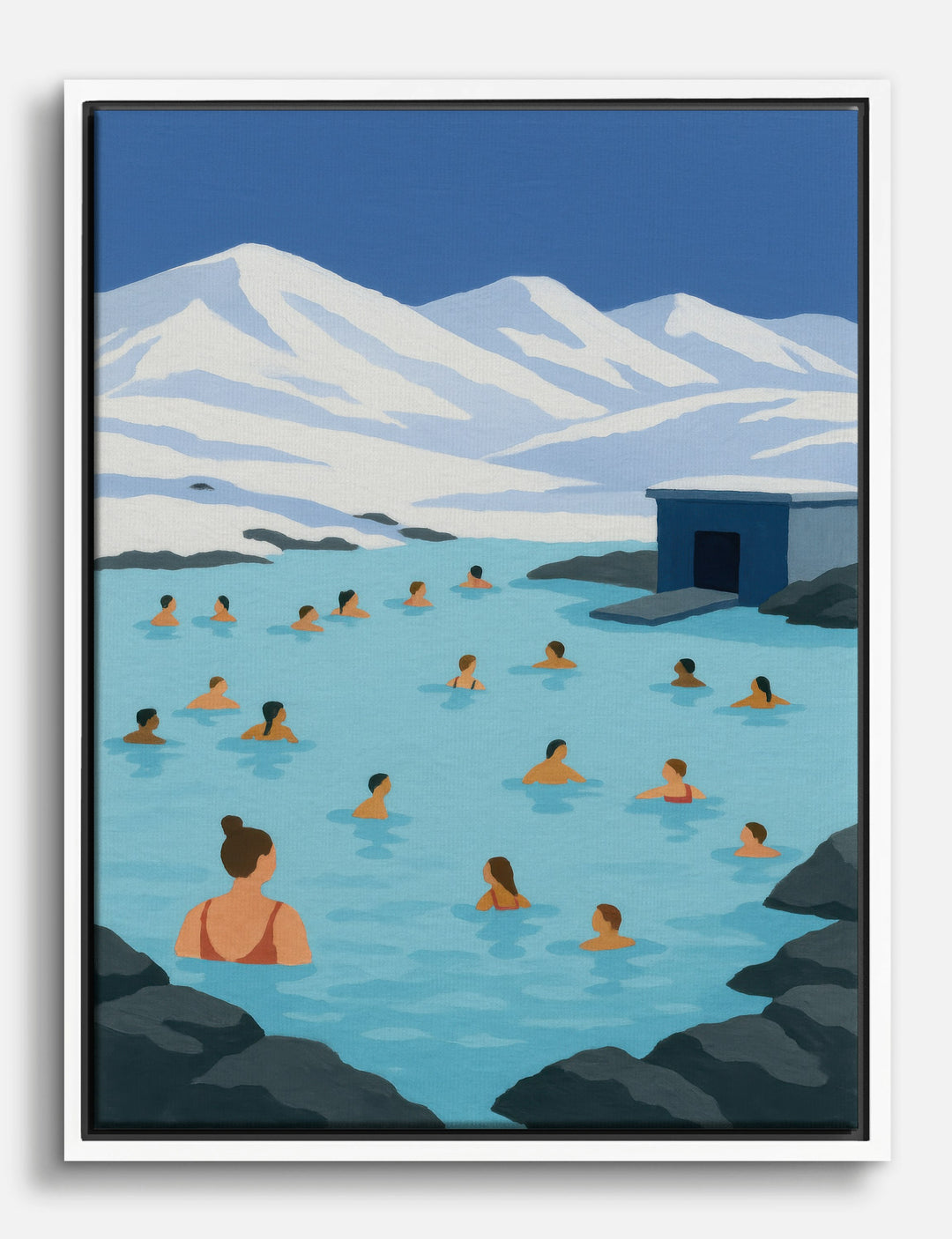 Think of this as your daily dose of wanderlust. Crisp white peaks and icy blues set the stage, while warm, inviting waters are filled with friendly faces soaking up the magic. Hang this in your living room or bedroom and let it transport you to the heart of Iceland, where relaxation is a ritual and every day feels like a getaway. The soft, cool palette makes it a fresh fit for modern, minimalist, or Scandinavian spaces—proof that adventure and calm can live side by side on your walls.