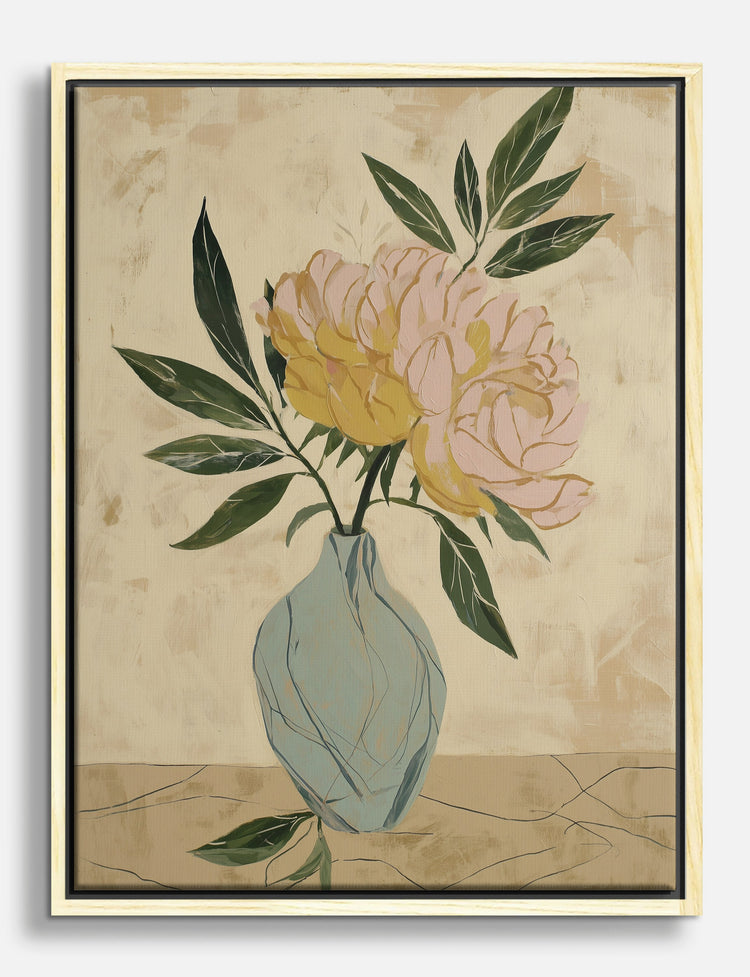 Fresh florals, timeless style—this piece brings the soft elegance of peonies right to your walls. The gentle blush and golden petals pop against lush green leaves, all cradled in a chic, modern vase.