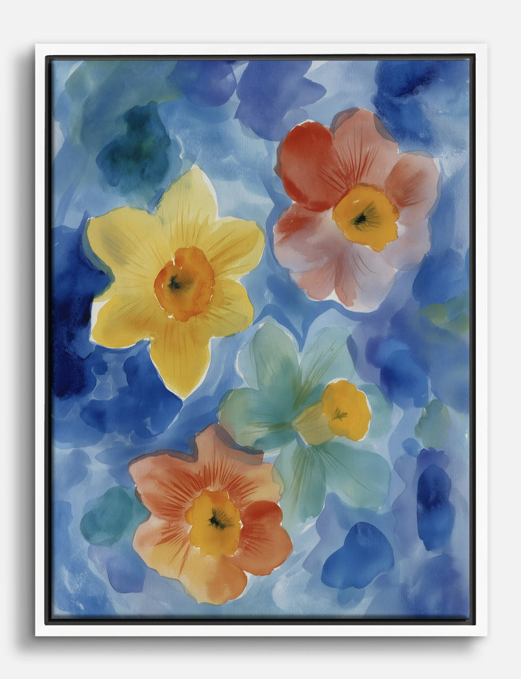 A burst of color and joy, this piece brings the feeling of a fresh spring morning right into your home. Each flower seems to bloom before your eyes, surrounded by a dreamy wash of sky blues and soft pastels.