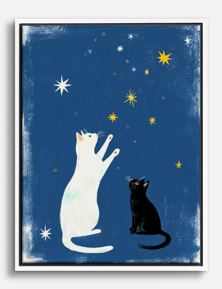 Ever wish your walls could tell a story? Meet the duo that brings a quiet sense of wonder to any corner of your home. A white cat reaches up, paws outstretched to the twinkling stars, while its black companion gazes skyward, both set against a deep, dreamy blue.