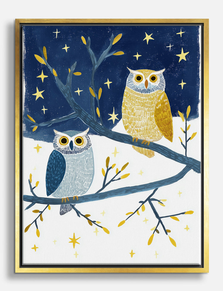Two wise owls perch beneath a midnight sky, surrounded by a sprinkle of golden stars—this piece brings a calm, magical energy into your space. The deep blues and warm golden hues create instant coziness, making it feel like your own secret corner of the forest.