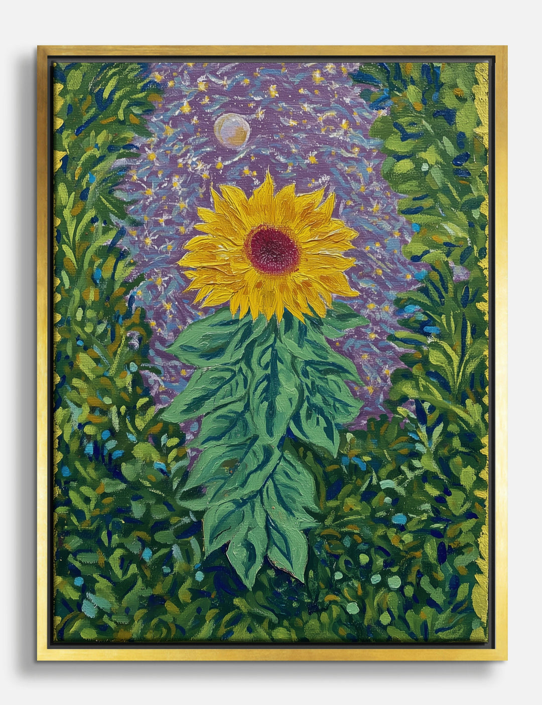 A sunflower glowing under a swirl of stars—this piece instantly uplifts any space with its joyful energy. The lush green leaves and vibrant yellow petals pop against a dreamy, Van Gogh-inspired night sky, making it feel like a window into nature’s magic.