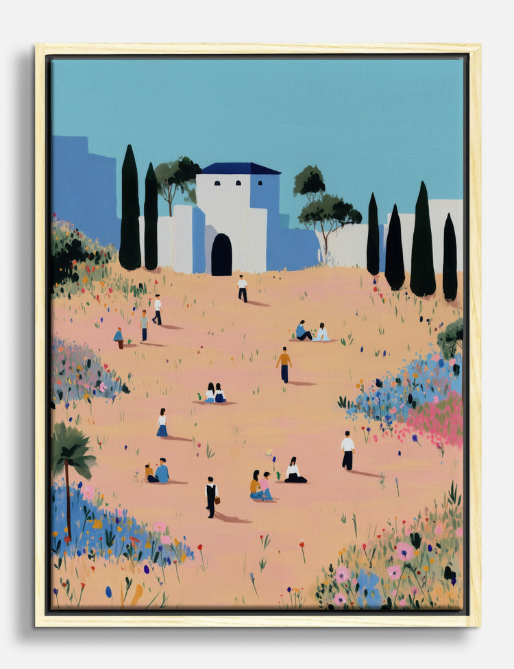 Sun-washed hills, blooming wildflowers, and leisurely wanderers—this piece brings the warmth of a Tuscan afternoon right into your home. Its the kind of scene that instantly softens a space, inviting you to pause and soak up the simple joys.