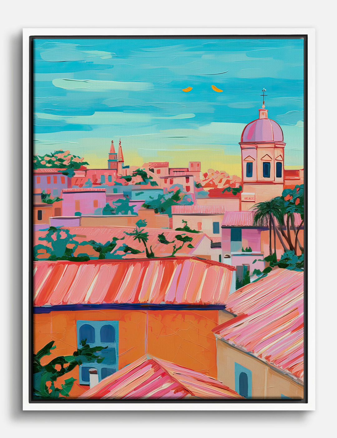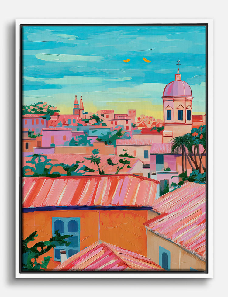 Golden rooftops bask in the glow of a dreamy Italian sunset, inviting warmth and wanderlust right into your home. Youll love how this vibrant cityscape instantly energizes your space—perfect for adding a pop of color to your living room or bedroom. The playful palette of pinks, oranges, and blues blends effortlessly with both modern and eclectic styles, making every day feel like a Mediterranean escape. Bring home a slice of joy and let your walls tell a story of adventure.