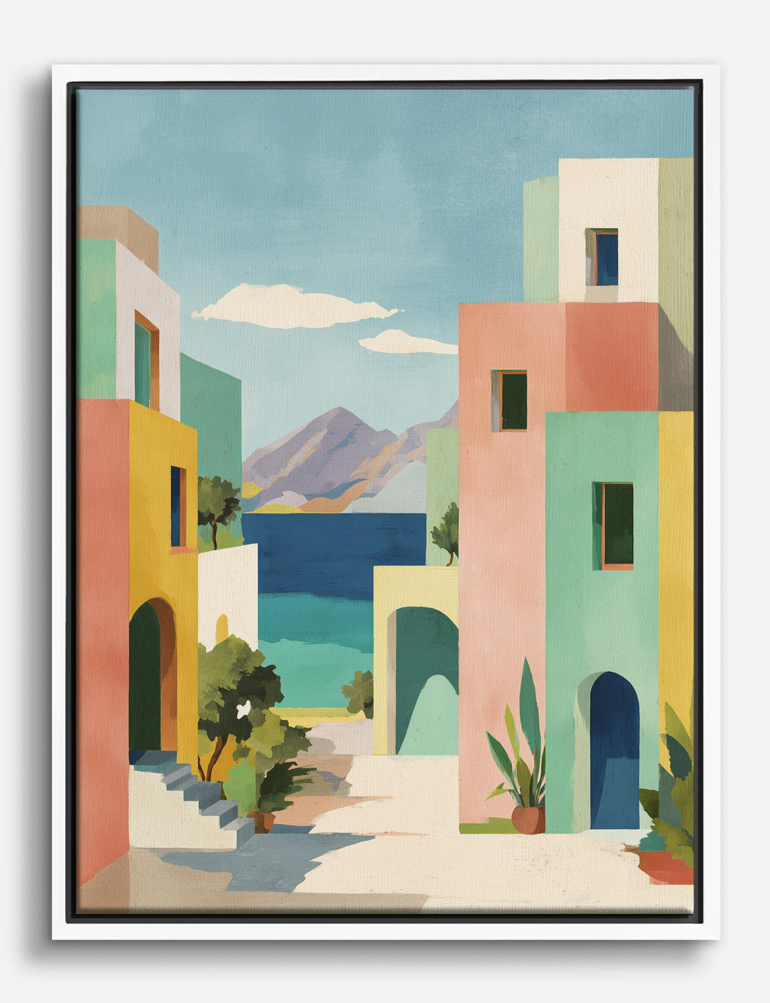 Color-blocked buildings in soft pastels pop against clear blue skies and tranquil sea—this piece instantly brings vacation vibes home. You’ll feel like you’re wandering sun-warmed streets every time you pass by, with every glance offering a breath of fresh, coastal air.