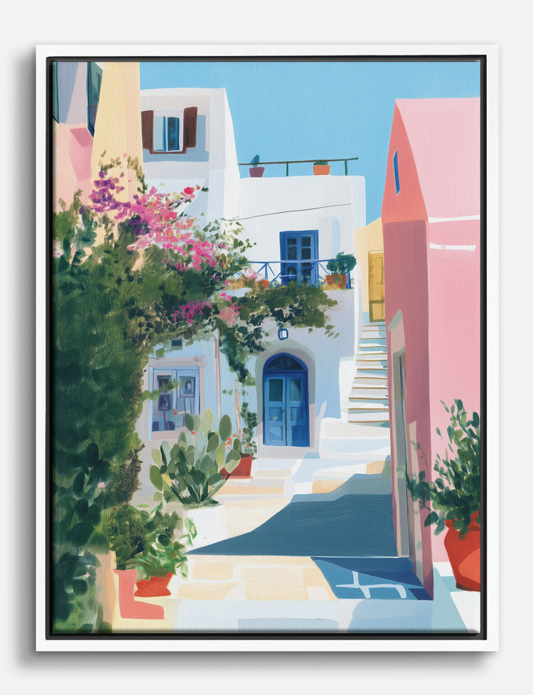 Step into a sun-drenched alleyway where pastel walls and blooming bougainvillea create an instant escape to the Mediterranean. This lively piece captures the effortless charm of Santorini with its crisp blues, soft pinks, and lush greenery.