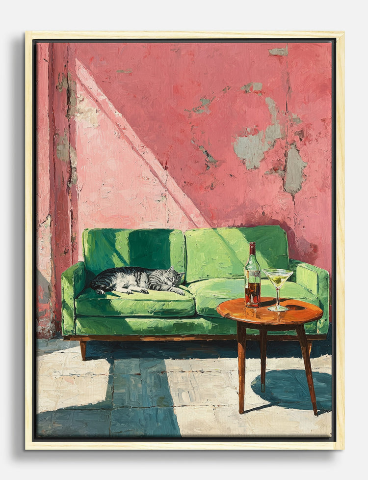 Sun-drenched afternoons just got a little more stylish. A relaxed tabby cat sprawls across a vibrant green sofa, soaking up the warmth, while a pair of cocktails wait on a mid-century table—this piece invites you to slow down and savor the moment.