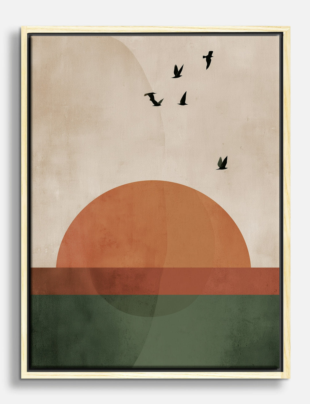 Bold shapes and earthy tones come together in this striking piece, where a warm sun dips behind a deep horizon as birds soar above. It’s a scene that feels both timeless and modern, inviting a sense of calm and quiet confidence into your space.