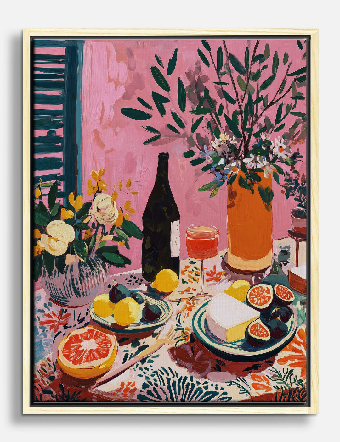 A joyful riot of color fills your space with this lively, sun-soaked scene. Grapefruit, figs, and lemons pop against a playful pink backdrop, inviting you to savor every delicious detail.