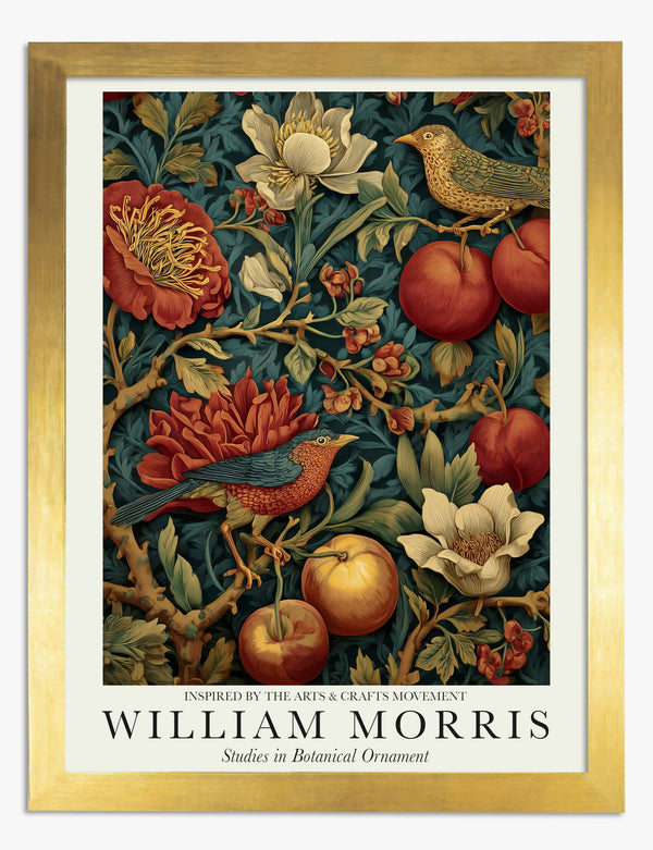 Lámina botánica con ave y magnolias inspirada en William Morris