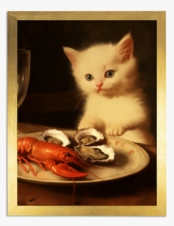 Lámina de bodegón con gatito, langosta y ostras
