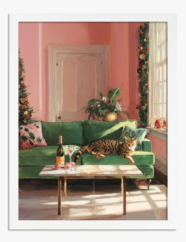 Lámina gato al sol de otoño en sofá de terciopelo verde