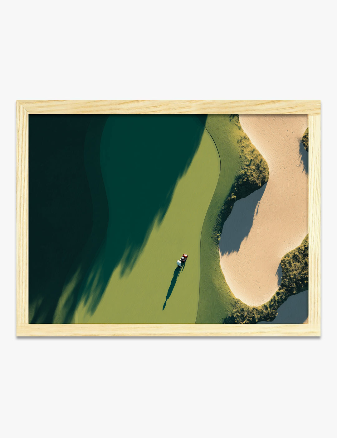 From above, a sunlit green stretches out—a perfect, peaceful moment frozen in time. This striking print instantly adds a sense of calm focus and quiet sophistication to your space. Whether you’re a golf lover or simply appreciate serene, modern style, this piece brings an effortless touch of luxury. The deep greens and soft beiges blend seamlessly with both contemporary and classic decor, making it a versatile choice for your living room or office. The lone golfer and sweeping shadows evoke a feeling of possibility, inviting you to pause and savor a moment of stillness. Curate your home with art that feels uniquely you—no renovation required. With Fab, transforming your space is as easy as teeing up for a perfect day.