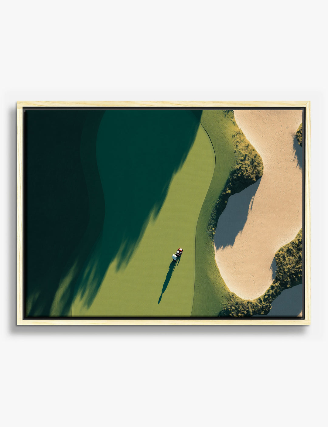 From above, the sweeping greens and golden sands create a scene that’s both peaceful and striking. There’s something meditative about this moment—a lone golfer, long shadow, and endless space to dream big. This piece brings a subtle sense of calm and quiet focus, making it perfect for your office or living room. The rich greens and warm neutral tones will pop against both modern and classic decor, effortlessly tying together your favorite space. It’s an instant way to add a touch of sophistication and inspiration, reminding you that every day offers a fresh perspective. Let this art be your daily reminder to carve out moments of clarity and style, right at home.