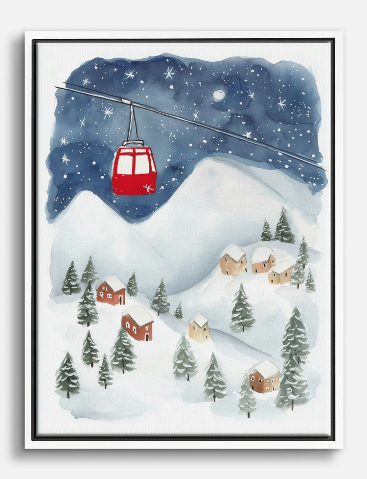 Snow-kissed rooftops and a cozy village glow set the stage for winter magic in your home. This charming print captures the hush and wonder of a snowy night, complete with a bright red cable car gliding above the mountains—inviting a sense of adventure and warmth.