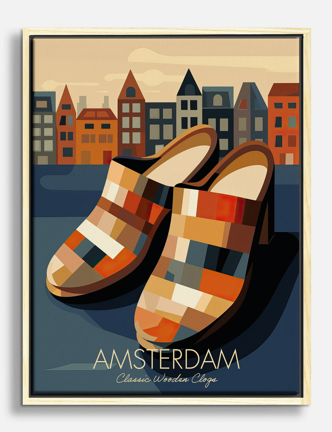 Bold color blocks and classic wooden clogs bring a playful Dutch twist to your walls. This piece pops with warm oranges, rich browns, and cool blues, instantly energizing your space with a sense of wanderlust and charm. Imagine it in your entryway or living room—every glance is a little reminder of your love for travel and unique style. Affordable art, endless personality—because your home should tell your story.