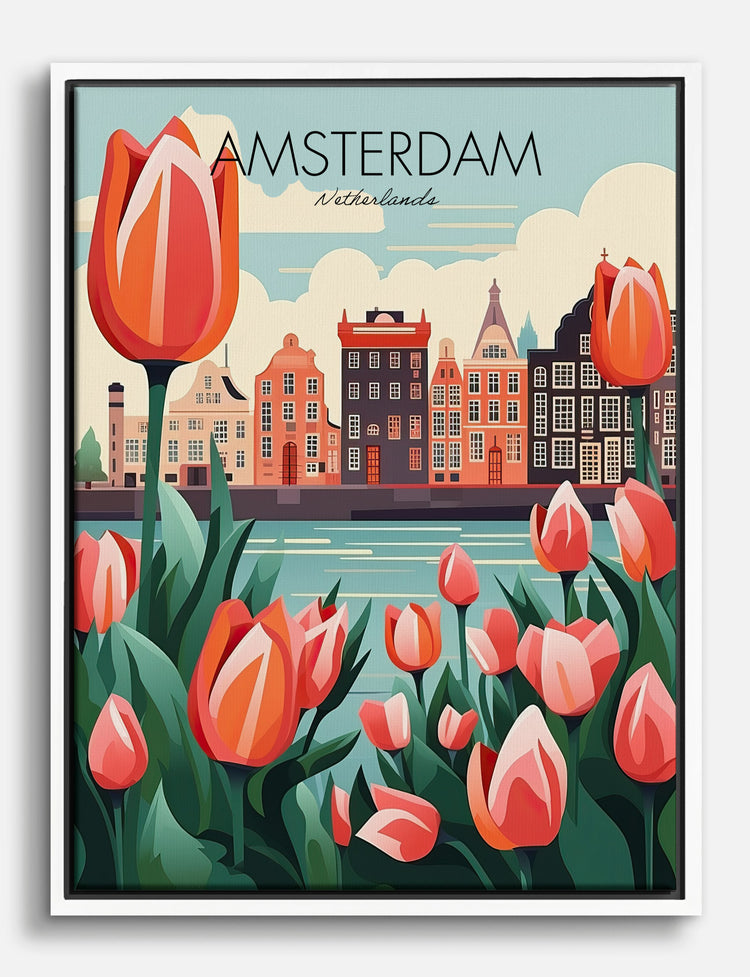 Vivid tulips burst to life against the iconic canals and gabled houses of Amsterdam, inviting you to bring a bit of Dutch magic home. This piece instantly energizes your space with its playful pops of coral and green—perfect for brightening your living room or adding a cheerful note to your office. The warm, vintage-inspired palette pairs beautifully with both modern and classic decor, making it easy to celebrate your unique style (and love of travel) every day.